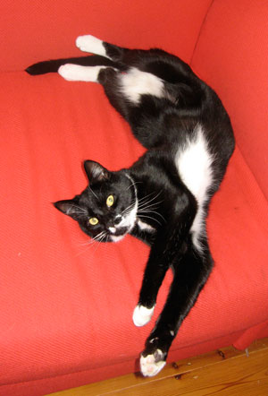 Ped is a complete dag. When it’s hot, he sleeps on his back with his belly exposed and his body twisted. Also rare in a cat, he enjoys a belly rub and never attacks us. And speaking of his belly, it was only after we’d got him home that we discovered his coolest marking – a perfectly symmetrical white patch on his belly shaped exactly like a bat.